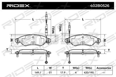Комплект тормозных колодок, дисковый тормоз 402B0526 RIDEX Датчик износа вкл. датчик износа , Дополнительный артикул / дополнительная информация 2 с прижимной пластиной , Материал Low-Metallic , WVA номер 23275 , Толщина 17,9 мм, Ширина 149,1 мм, Высота 51 мм, Тормозная установка Bosch , Сторона установки передний мост , Длина предупреждающего контакта 190 мм, Длина предупреждающего контакта 420 мм, Длина 148,9 мм, Высота 48,1 мм, Толщина 17,5 мм, Количество датчиков износа 4 на ось, Длина предупреждающего контакта 180 мм, Длина предупреждающего контакта 410 мм, Дополнительный артикул / дополнительная информация 2 с пленкой для оклеивания , Дополнительный артикул / дополнительная информация 2 без прижимной пластины , Дополнительный артикул / Дополнительная информация без аксессуаров , выполняет нормы ЕЭК ECE-R90 . Комплект тормозных колодок, дисковый тормоз подходит для CITROËN (Ситроен) C5 I (DC_) (К5 и (дк_)) 2001 - 2005, CITROËN (Ситроен) C5 I Break (DE_) (К5 и бреаk (де_)) 2001 - 2004, CITROËN (Ситроен) C5 II (RC_) (К5 ии (рк_)) 2004 - 2024, CITROËN (Ситроен) C5 II Break (RE_) (К5 ии бреаk (ре_)) 2004 - 2024.