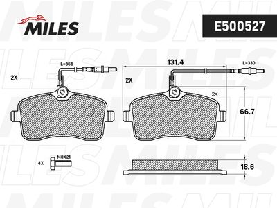 Комплект тормозных колодок, дисковый тормоз E500527 MILES Сторона установки спереди , Материал фрикционной накладки Керамика , Длина 131,4 мм, Ширина 66,7 мм, Толщина 18,6 мм, Датчик износа с интегрированным датчиком износа , Количество датчиков износа 4 на ось, Дополнительный артикул / дополнительная информация 2 с винтами . Комплект тормозных колодок, дисковый тормоз подходит для PEUGEOT (Пежо) 407 (6D_) (407 (6д_)) 2004 - 2011, PEUGEOT (Пежо) 407 SW (6E_) (407 сw (6е_)) 2004 - 2011.