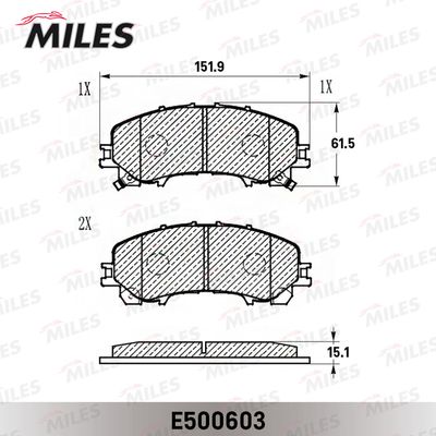 Комплект тормозных колодок, дисковый тормоз E500603 MILES Сторона установки спереди , Материал фрикционной накладки Керамика , Длина 151,9 мм, Ширина 61,5 мм, Толщина 15,1 мм, Датчик износа с звуковым предупреждением износа , Количество датчиков износа 2 на ось. Комплект тормозных колодок, дисковый тормоз подходит для NISSAN (Ниссан) X-TRAIL (T32_) (X-траил (т32_)) 2013 - 2024, RENAULT (Рено) KOLEOS II (HC_) (Kолеос ии (хк_)) 2016 - 2024, INFINITI (Инфинити) Q50 (Q50) 2013 - 2024, INFINITI (Инфинити) Q60 купе (Q60 купе) 2016 - 2024.